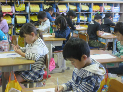 1年生はテストの隊形になって、計算大会をやっていました。小さな数の計算ですが、一生懸命に取り組んでいました。