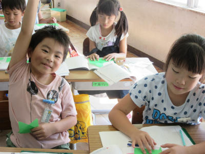 研究授業の近い2年生は、算数を頑張っています。今日は、三角形から四角形を作る作業をしていました。パズルみたいで、楽しそうでした。