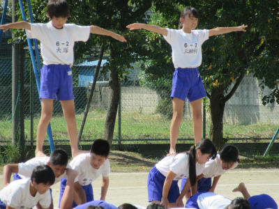 ピラミッドから次の技になるのも、すごくきれいに完成していました。約2週間の練習で、よくここまでできたなあと思います。明日は、高学年としても、全力で頑張ってください。