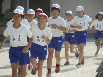 準備運動が終わり、『用意、ピー』でスタートをしました。自分のペースでどんどん走り出しました。5分間走を、しっかり頑張っていました。