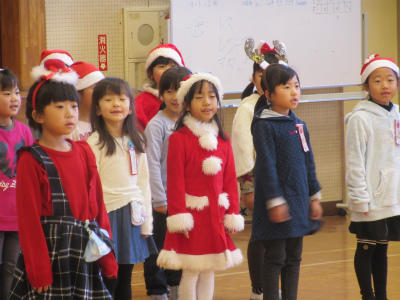 サンタさんが登場したときは、歓声が上がりました。最後に、学年全体で集合写真を撮って、終わりにしました。とてもかわいい発表ができました。