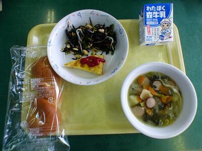 本日の献立は、ツイストパン、アンサンブルエッグ、ケチャップ、ポトフ、鉄骨サラダ、青じそドレッシング、牛乳でした。