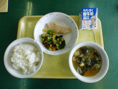 本日の献立は、ごはん、鶏肉のガーリック焼き、コンソメスープ、コーンサラダ、牛乳でした。