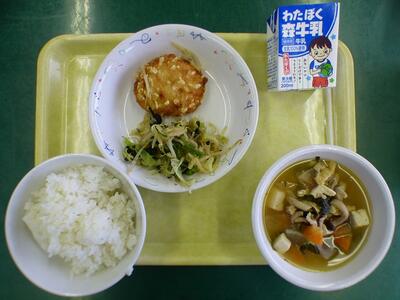 本日の献立は、ごはん、エビはんぺん揚げ、さつま汁、おひたし、牛乳でした。
