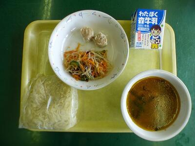 本日の献立は、中華麺、マーボーラーメン、シュウマイ、春雨サラダ、牛乳でした。