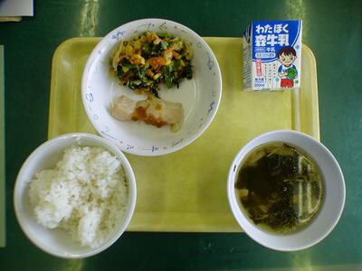 本日の献立は、ごはん、とり肉のねぎしょうゆだれかけ、野菜のごまみそ和え、鯛のすまし汁、牛乳でした。