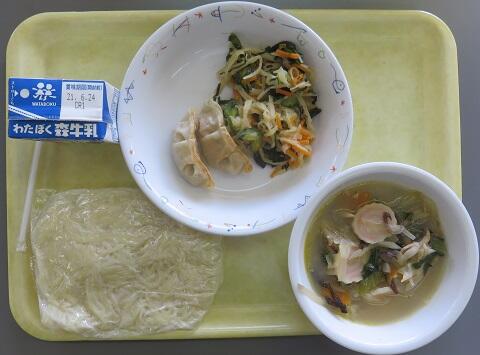 本日の献立は、ちゃんぽん麺、焼き餃子、ピリ辛サラダ、牛乳でした。