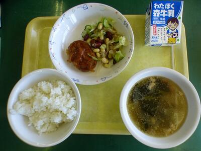 本日の献立は、ごはん、ハンバーグデミグラスソース、とうがん入り洋風スープ、ビーンズサラダ、玉ねぎドレッシング、牛乳でした。