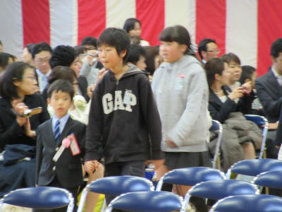 1年生が6年生に連れられて、堂々と入場してきました。待ちに待った入学式の始まりです。ピカピカの1年生のスタートです。今日から、南桜井小学校の1年生です。
