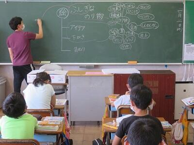 はじめに、担任が子どもたちとやり取りをしながら、イメージマップを板書しながら、子どもたちのイメージを膨らませようとがんばっていました。考えのキャッチボールをしていると、次々にアイディアが生まれてきます。子どもたちも活発に発言し、イメージが膨らんできているようでした。どんな絵ができるのか楽しみです。
