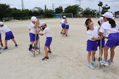 久しぶりに体育もできるので、この時間も3クラスが同時に授業を行っていました。ボールを使ったり輪をつかったり、竹馬や短縄を使ったりして元気いっぱい運動していました。