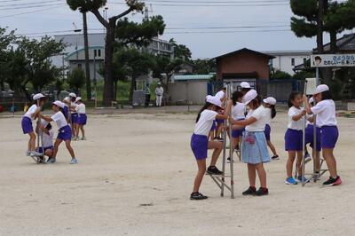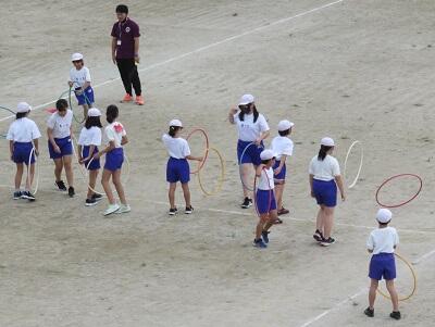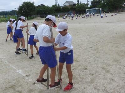 3時間目に1年生が合同体育を行っていました。ミニハードルや輪などを置いてとび越えたり、またいだりしながら走る運動を行っていました。自然に「がんばれ~!」「がんばれ~!」の声援が飛び交い、一段と気合が入ったようです。