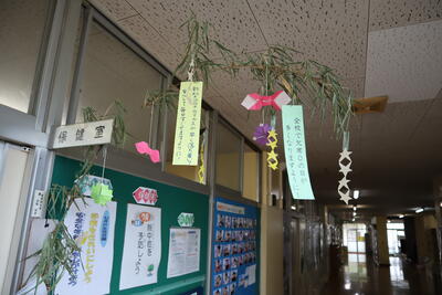 職員室や保健室など、廊下の笹に七夕飾りや短冊が揺れています。