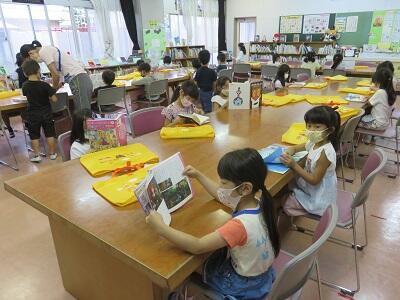 1時間目、1年1組が図書室にやってきました。先生から、図書室のルールについてお話があり、代本板の使い方も教えていただきました。その後、読みたい本を自分で決めて、実際に代本板を使っていました。皆、静かに読書をしていました。