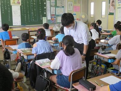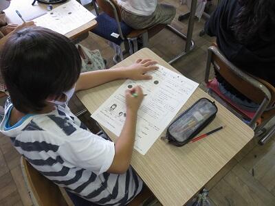 5年生の英語の授業は、「How many・・・」「How  much・・・」の違いを学習していました。後半は、リスニングのテストでした。問題文が配付され、2人の英語の先生が、会話しているのを聴いて答えを選ぶという方式でした。みんな、よく聞き取っているようです。