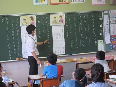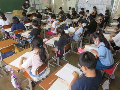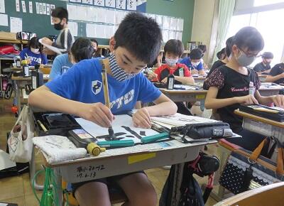 5年生の国語の授業風景です。丁度、板書を写しているところだったので、皆、静かに集中して鉛筆を走らせていました。姿勢が正しく、左手を定位置において身体を支えている子は、どの子も、しっかりとした文字を書いています。姿勢が崩れると、背骨が曲がり、首も必要以上に曲がり、痛くなる傾向があります。ノートと目の距離も近く、視力にも影響することもあります。学校でも、鉛筆の持ち方や姿勢について、ことあるごとに指導をしていますが、ご家庭でも、お子さんが勉強しているときに、後ろから姿勢を見てみてください。もし、気になるような姿勢をしていたら、そっと教えてあげてください。