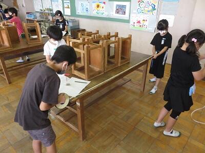 5年生は図工で「見つけて!ワイヤードリーム」という単元をやっています。アルミ製のはり金を空き缶や鉛筆などに巻いてコイル状にしたり、折ったり、つなげたりして創作活動を楽しんでいました。ペンチを使ってはり金を切ることもやっていました。
