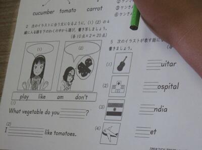 6年生の教室へ行くと、英語のテストをやっていました。新しい学習指導要領では、英語も文字の読み書きを学習するので、今回のテストも、写真のように文字を書く問題が出されていました。