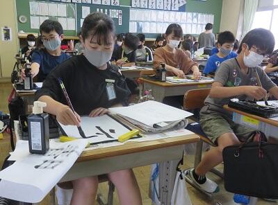 6年生の教室へ向かうと・・・シーンとしています。習字の授業でした。『快晴』を書いていました。皆、真剣な表情で筆を動かしていました。素晴らしい集中力です。