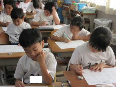 1年生は、10マス計算をやっていました。9+□、9+□、9+□……というふうに、ずっと計算をやっていました。集中して、先生の近くでやっている子もいました。