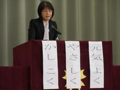 始業式では、まだ担任の先生が発表になっていないので、緊張感のあるままに校長先生の話を聞いていました。学校教育目標の『かしこく・やさしく・元気よく』の3つの柱を基本に、1年間しっかり取り組んでください。