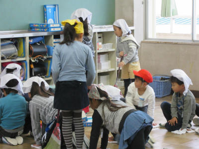 1年生の給食が終わると、しっかりと6年生が後片付けのお手伝いに来てくれています。1年生にとって、6年生の力はとても大きいようです。