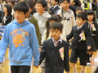 1年生が6年生に連れられて、堂々と入場してきました。待ちに待った入学式の始まりです。ピカピカの1年生のスタートです。今日から、南桜井小学校の1年生です。