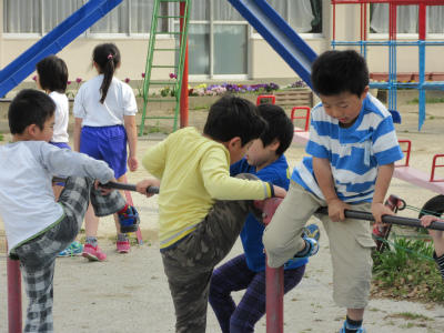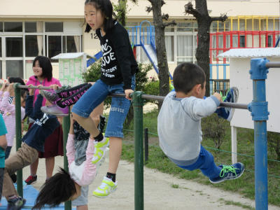 学校に登校してくると、子どもたちはすぐ外に出て来て、マラソンやリレーをやっている子、また、鉄棒をやっている子がいます。朝から、体力作りに励んでいて素晴らしいです。いろいろな技ができるといいですね。