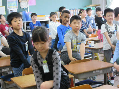 今日の授業参観は、1組も2組も、ばらばら言葉をやっていました。何文字の〇〇というヒントを言い、一斉に1音を発します。ステレオゲームみたいなものです。耳をすませて、聞いていました。