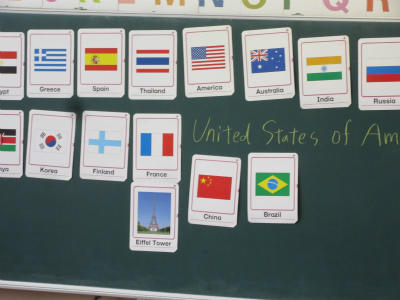 6年生が、グループごとに好きな外国を選んで、会話するゲームをやっていました。他の班と重ならないように、どこの国にするか選んでいました。