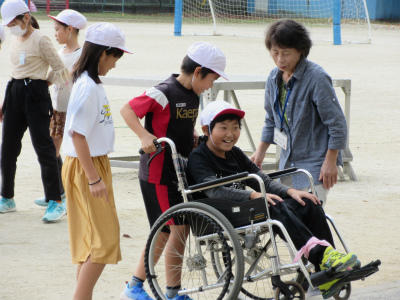 今日、4年生が、車いす体験をしました。段差があるところやまっすぐにいかない道の誘導を経験しました。運ばれている児童も、気持ちよかったようです。