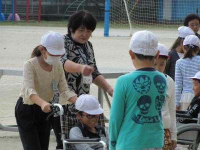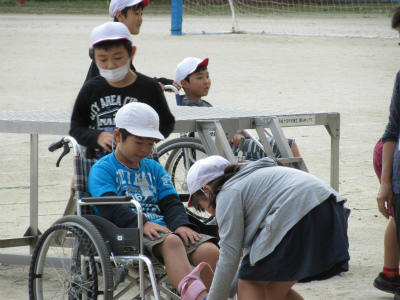 2組も、次の時間に行いました。3人1人組になって、車いすを押す子、誘導する子、障害の役をやっている子で、交代しながらやっていました。