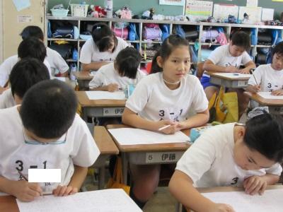 今日は、チャレンジタイム・算数でした。4年生は、計算を頑張っていました。両面印刷になっていて、表の問題は難しいですが、裏の問題は、とても易しくなっていました。