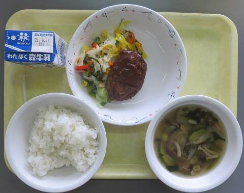 本日の献立は、ご飯、ハンバーグプルーンソース、夏野菜汁、彩り野菜のサラダ、ノンオイルドレッシング、牛乳でした。