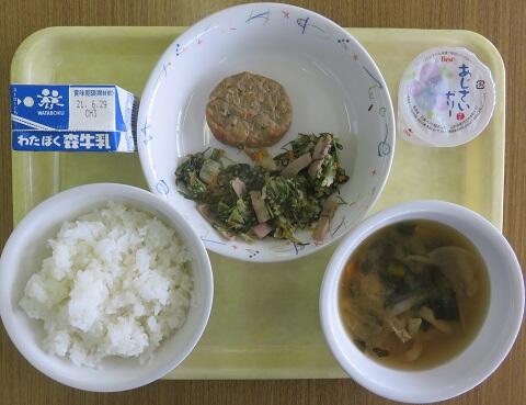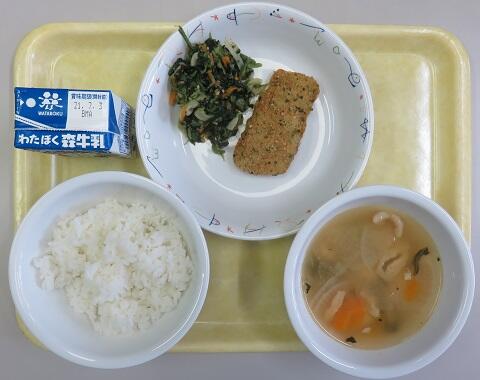 本日の献立は、ご飯、白身魚ののりごま揚げ、青菜のごまみそ和え、いももち汁、牛乳でした。