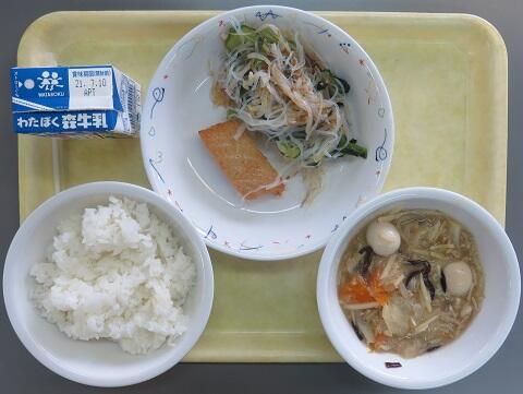 本日の献立は、もやしラーメン、肉まん、ハムサラダ(玉ねぎドレッシング)、牛乳でした。