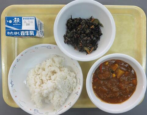 本日の献立は、麦ご飯、夏野菜カレー、ひじきとツナのサラダ、牛乳でした。