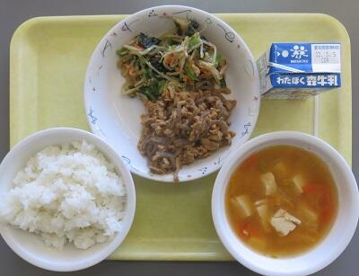 本日の献立は、ご飯、ビビンバ(肉)、ビビンバ(ナムル)、味噌キムチスープ、牛乳でした。