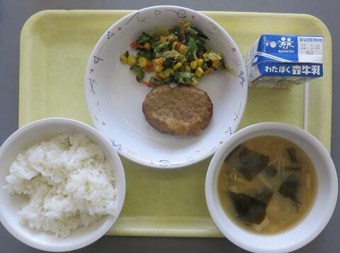 本日の献立は、ご飯、ハンバーグのおろしソース、みそ汁、野菜のごま醤油和え、牛乳でした。