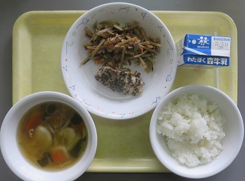 本日の献立は、桜川小学校の給食委員会が考えた献立だそうです。わかめご飯、かぼちゃコロッケ、五目きんぴら、豚汁、牛乳でした。
