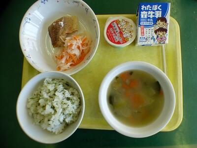 本日の献立は、ごはん、豚肉のねぎしょうゆだれかけ、どさんこ汁、磯香和え、刻みのり、牛乳でした。
