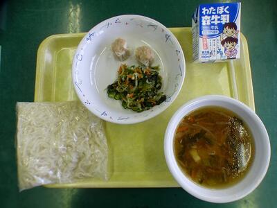 本日の献立は、豆腐ラーメン、蒸しシュウマイ、華風和え、牛乳でした。