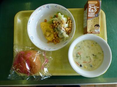 本日の献立は、フラワーロール、クリームシチュー、シーザーサラダ、クルトン、シーザードレッシング、コーヒー牛乳でした。