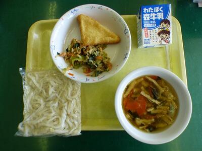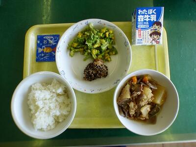 本日の献立は、ごはん、小魚ふりかけ、鶏肉のごま焼き、豚肉と大根の煮物、ブロッコリーのしょうゆ和え、牛乳でした。