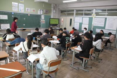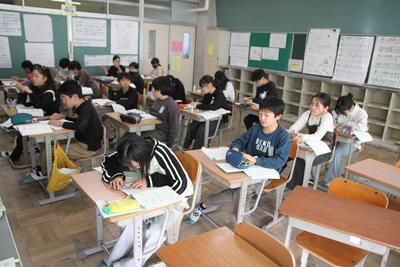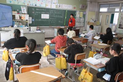 5年生の算数では学年を3つのクラスの分けて学習をしています。今日は、三角形の面積について学習します。それぞれのコースの先生による特別授業で、しっかり学びます。