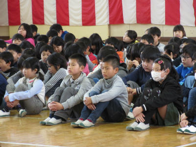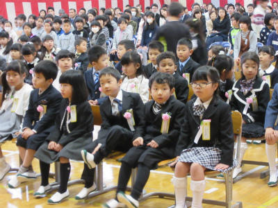 新1年生のために、最高学年の6年生が歌の歓迎をしてくれました。入学した1年生は、6年生の歌を目を丸くして聞いていました。お兄さん、お姉さんとしっかり仲よくしてください。