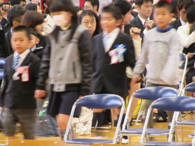 1年生が6年生に連れられて、堂々と入場してきました。待ちに待った入学式の始まりです。ピカピカの1年生のスタートです。今日から、南桜井小学校の1年生です。
