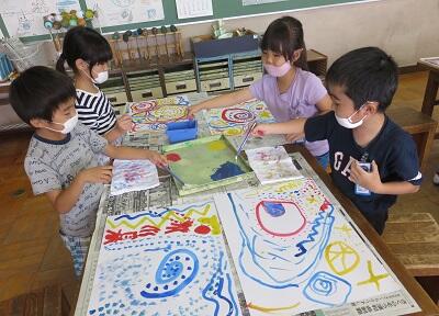 3~4人グループで色を3色決め、筆に絵具をつけて、大きなうずまきを描いたり、点々や波線、ギザギザ線など自由に描いていました。時々、色を変えながら夢中で絵筆を動かしていました。