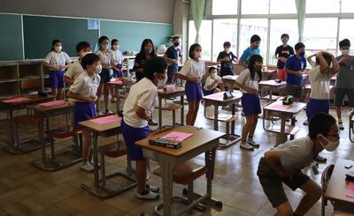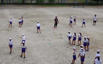 1年生が、1、2組合同で体育の授業をやっていました。体つくりの運動でケンパーや片足とびを楽しんでいました。