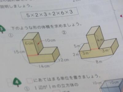 複雑な形の体積を求めていた写真の子は、教科書にマーカーペンで補助線を入れていました。自分が、どのようにしてこの問題を解いていくかを明確にしているこの子は、すばらしいですね。算数・数学は、補助線1本引けるかどうかで、その問題を解けるかどうかが左右されることもあります。補助線を引けたらその問題の9割は解けたと同じといってもいいかもしれません。